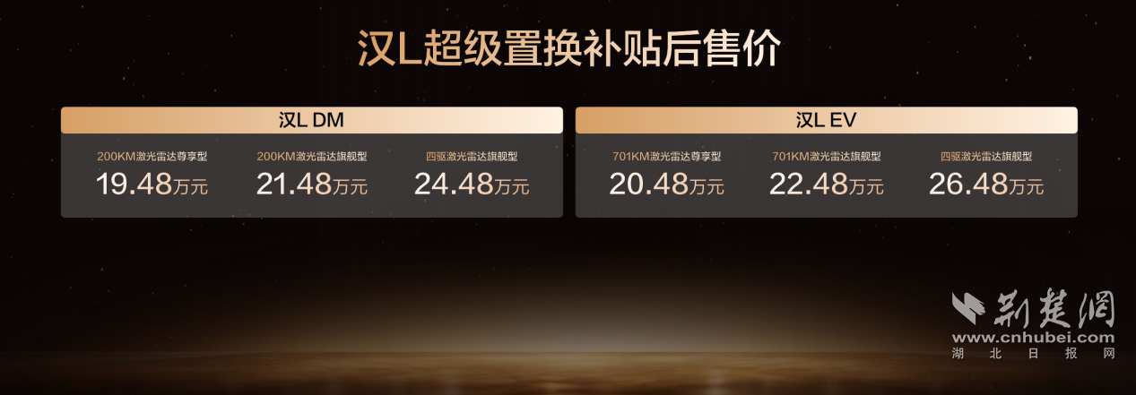 目前,汉L EV共有3款车型,补贴后售价为20.48万元-26.48万元;汉L Dm 3车型,补贴后售价19.48万元-24.48万元;同时,比亚迪还为用户准备了包括置换补贴在内的最高价值5.2万元的专属福利。 (上右有效期至12月31日)
