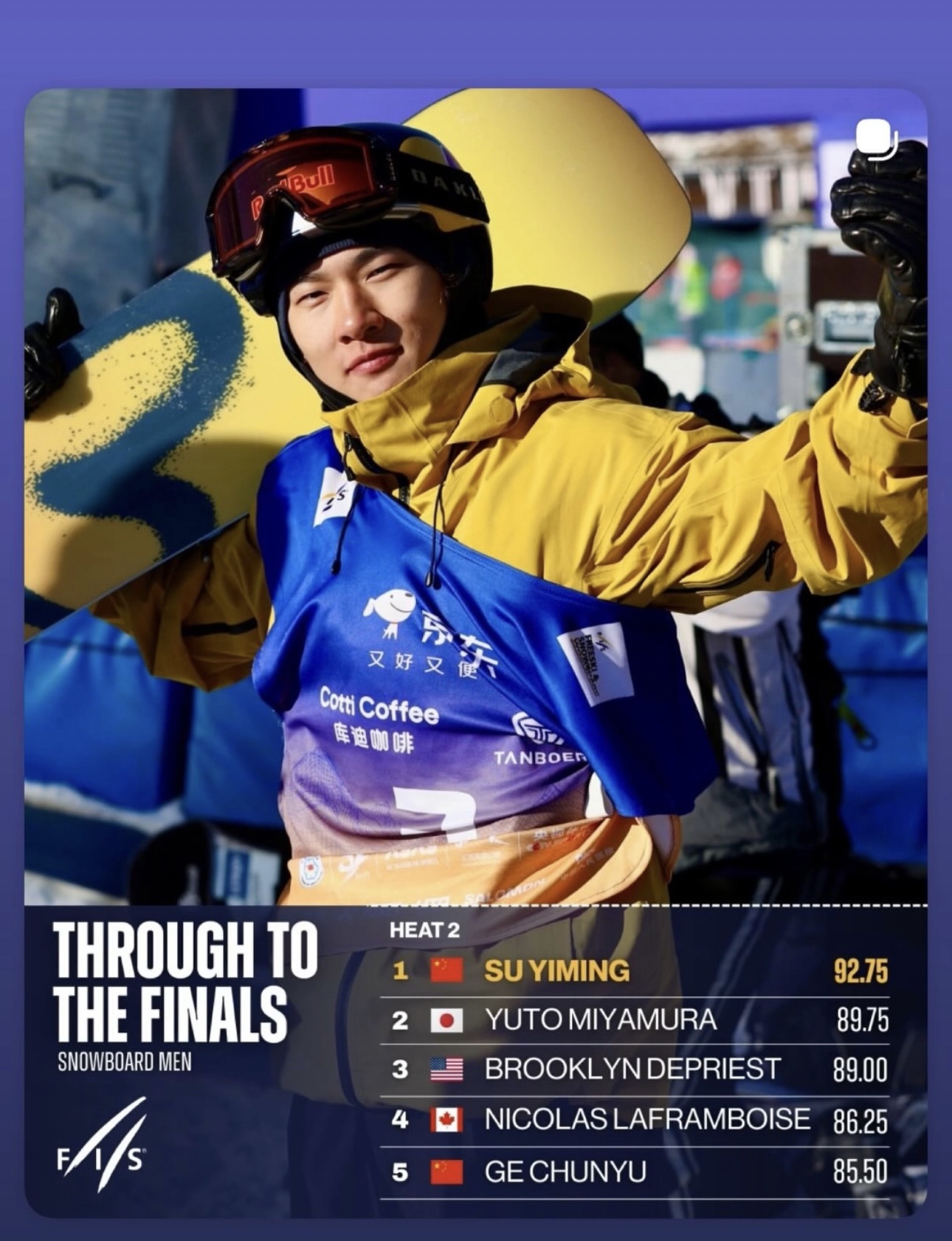27日,2025-2026国际滑雪联合会单板滑雪及自由式滑雪跳台世界杯崇礼站开赛。在男子单板滑雪大跳台资格赛中,中国选手苏一鸣完成1980的前转身,在第二轮中取得领先,以92.75分排名小组第一,晋级决赛。另一位中国选手葛春雨以85.50分排名第五,也获得了决赛资格。 上一篇:古人到底有多神奇?动画拆解千年木塔,一探究